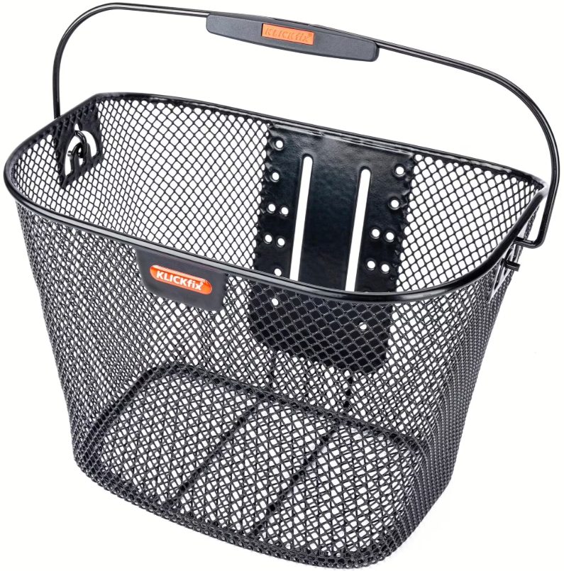 Oval, feinmaschig und abnehmbarDer „Oval Plus Korb“ ist ein ovaler, großer Fahrradkorb, der per Adapter an den Lenker geklickt wird – und mit einem weiteren Klick wieder abgenommen werden kann. Sein Griff lässt sich in 90°-Schritten arretieren. Die Adapterplatte lässt sich in verschiedenen Höhen montieren, sodass der Korb genug Platz für die Beleuchtung lassen kann. In den großvolumigen (18 l) und feinmaschigen Korb passen Taschen und mehr bis zu 7 kg. Maße (L x B x H): 27 x 25 x 36 cm.