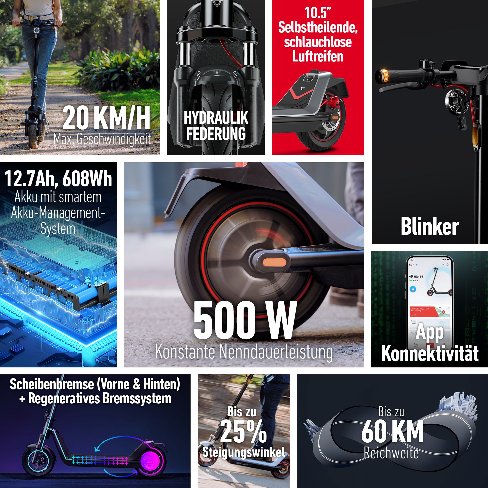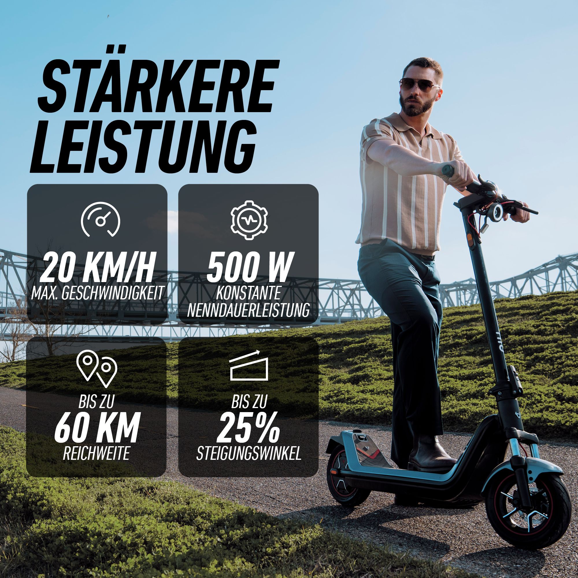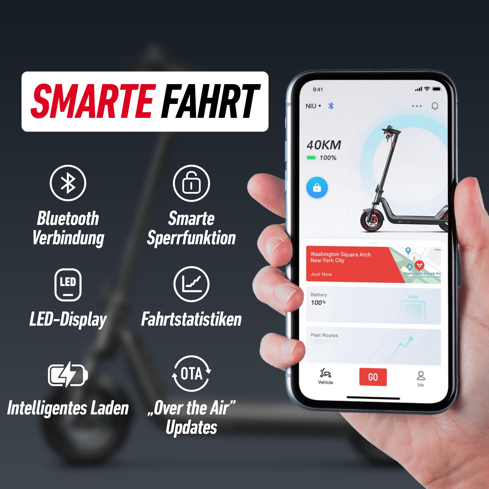 Der NIU KQi 300X kombiniert modernste Technik mit Alltags-Tauglichkeit. Ob Kopfsteinpflaster, Bordsteinkante oder längere Pendelstrecke – dieser Scooter meistert es mit Stil und Komfort. Intelligente Funktionen wie Bluetooth-App, LED-Scheinwerfer mit Blinker, selbstheilende Großreifen sowie das dreifache Bremssystem unterstreichen seinen hochwertigen Anspruch.